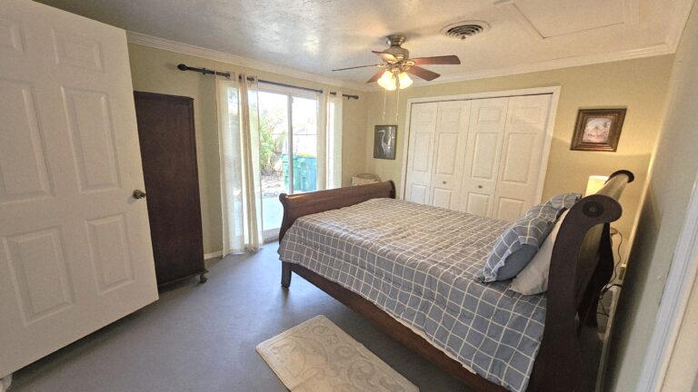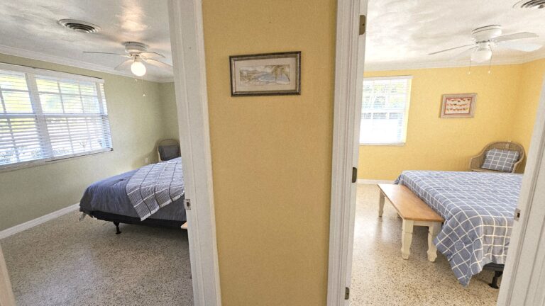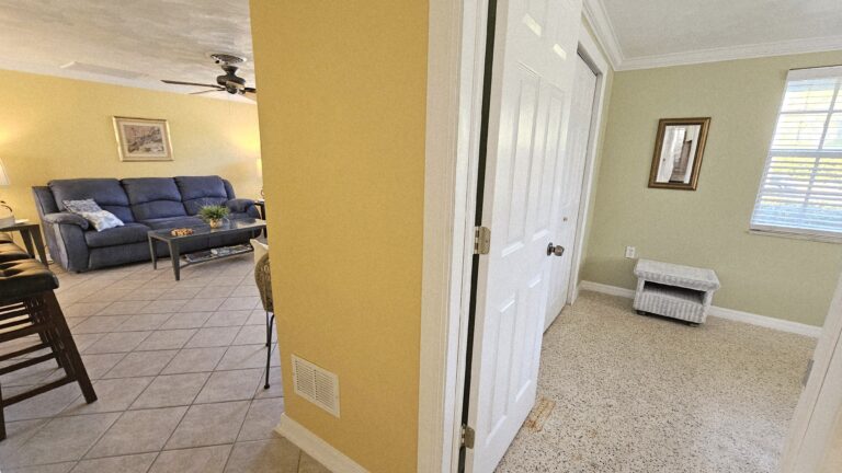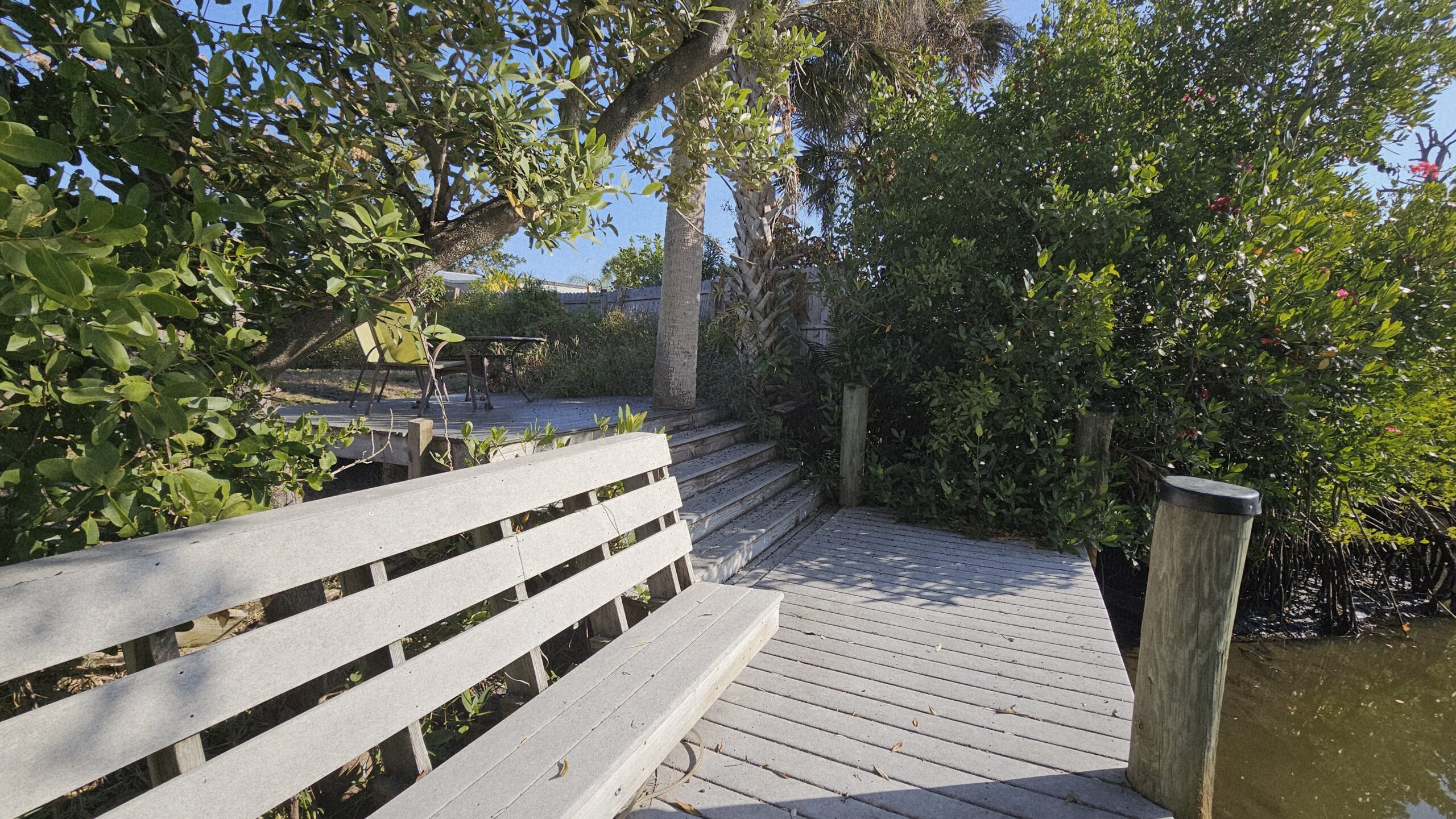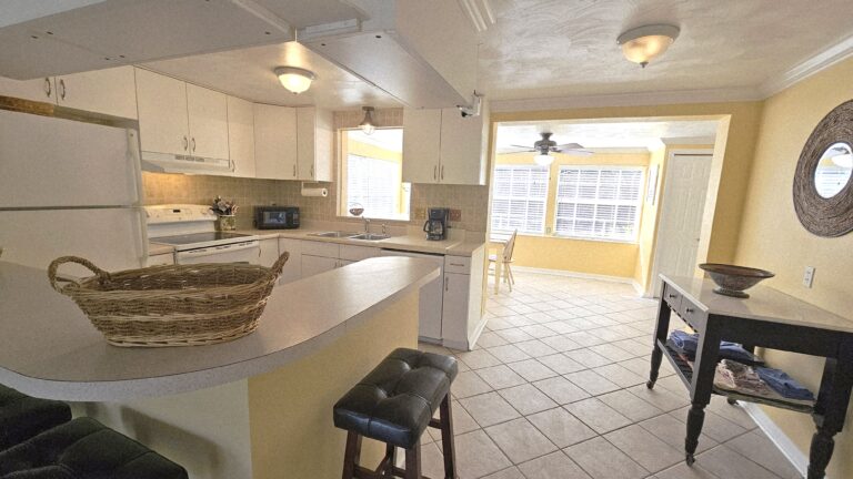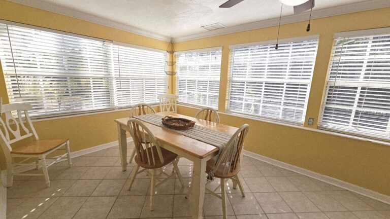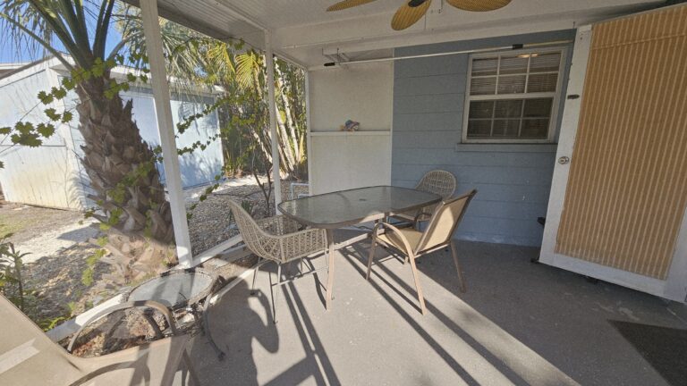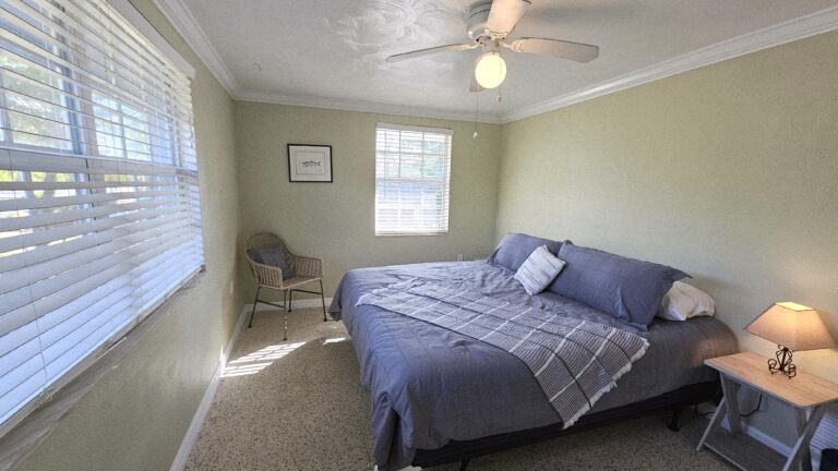 The home features a spacious fenced backyard, a screened lanai, and a deck with private dock on a waterway that leads to the Gulf of Mexico (two bridges to the bay – small boat only). The split-bedroom floor plan provides privacy, with the master bedroom separated from the two guest bedrooms. Fully furnished home to include all houseware items and linens. Full size washer/dryer and central heat/air.